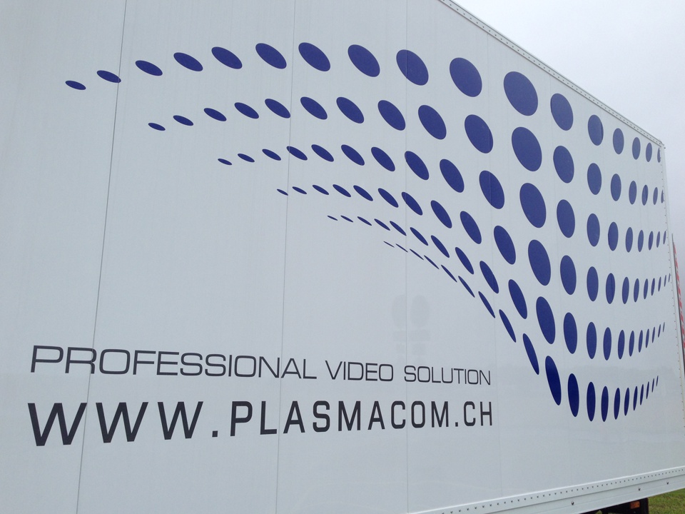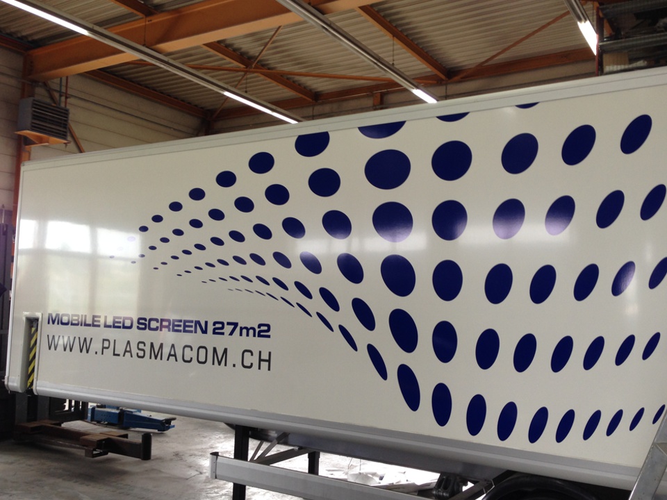 Intégrer de la publicité sur les véhicules fait partie de nos spécialités. Le design du logo aux courbes arrondies de l’entreprise Plasma Communication a été appliqué dans les parfaites mesures afin de le mettre en valeur sur les côtés du camion. Voitures, bus, camion ou quelque soit le véhicule que vous souhaitez personnaliser, nous répondons avec plaisir à toutes vos questions pour la réalisation de ce projet.